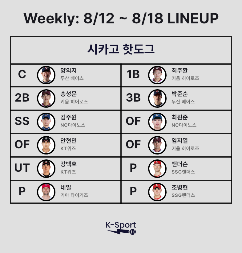 20주차 완벽한 라인업에는 양의지, 디아즈, 송성문, 김주원, 김현수가 여러 차례 이름을 올렸던 익숙한 얼굴들이 많았습니다. 문동주와 헤이수스가 이번 주 완벽한 라인업에 들어간 것도 놀랍지 않습니다. 다만, 몇몇 의외의 선수들도 있었습니다.